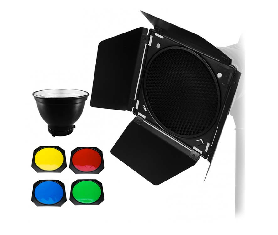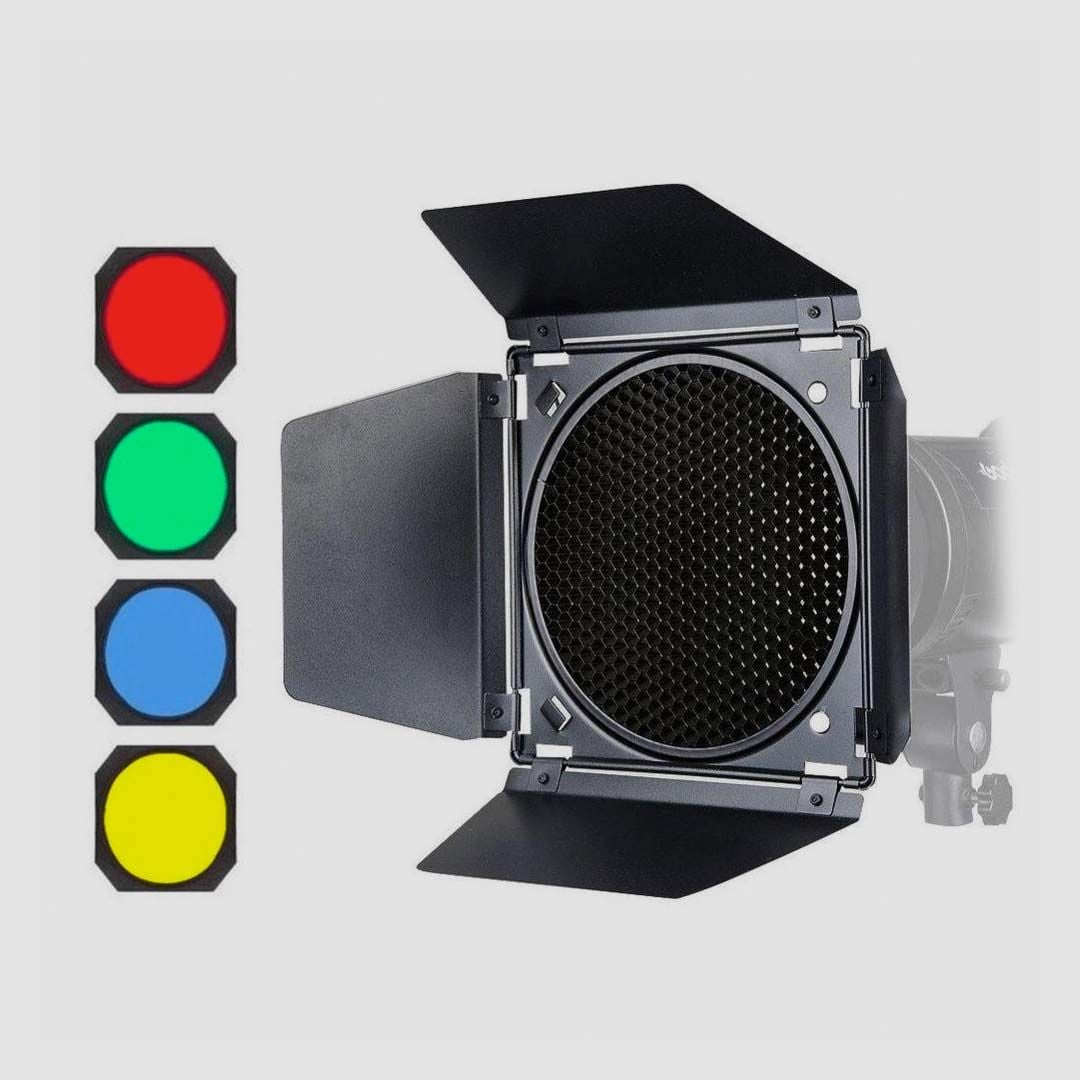 Đây là loại Barndoor 4 màu hoàn chỉnh nhất, bao gồm cả 4 bộ lọc màu đỏ, xanh lá, xanh dương và vàng.