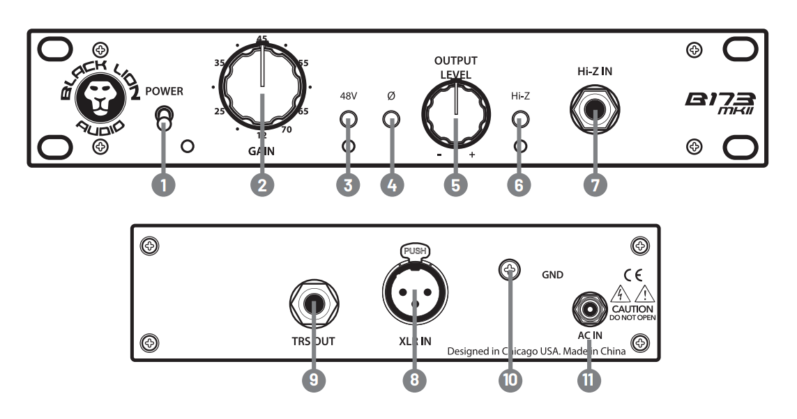 Do là tiền khuếch đại đơn kênh nên Black Lion Audio B173 MKII được trang bị 1 cổng input TRS ¼-inch Hi-Z dành riêng cho nhạc cụ tại mặt trước (có nút Hi-Z button để chuyển đổi giữa mic và inst), 1 cổng XLR in cho mic, 1 cổng TRS ¼-inch output ở mặt sau. Ngoài ra, nút bấm (số 3) để chuyển sang nguồn 48V cho các dòng micro condenser chuyên dụng. Cấu trúc cụ thể như sau: