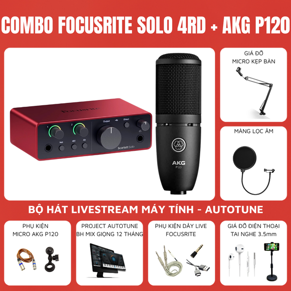 Bộ thu âm: Focusrite Scarlett Solo (Gen 3) - Micro thu âm AKG P120 là một lựa chọn lý tưởng nếu bạn đang cần các thiết bị chất lượng với chi phí phải chăng cho phòng thu tại gia. Combo thu âm là sự kết hợp hài hòa giữa sound card Focusrite Scarlett Solo Gen 3 và micro thu âm AKG P120. Trọn bộ thiết bị được PUStudio phân phối chính hãng với mức giá cạnh tranh cùng nhiều ưu đãi hấp dẫn. Liên hệ ngay để nhận tư vấn và trải nghiệm thực tế.