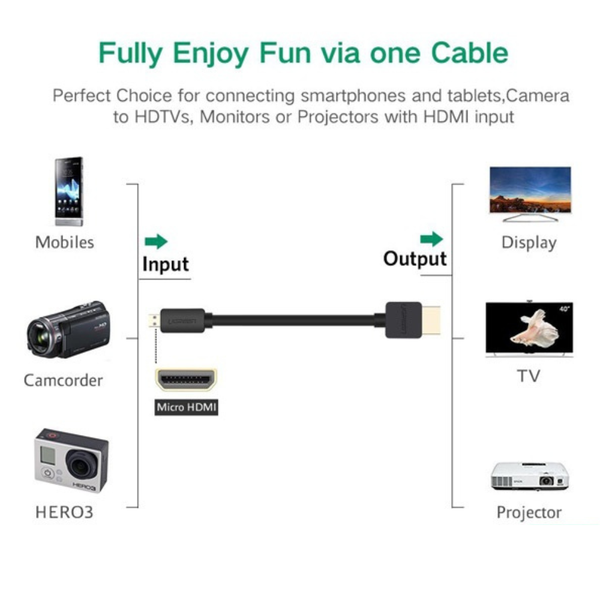 Cáp chuyển đổi này cho phép kết nối các thiết bị di động như máy ảnh, máy quay, máy tính bảng có cổng Micro HDMI với các thiết bị hiển thị như TV, máy chiếu có cổng HDMI, giúp bạn dễ dàng chia sẻ hình ảnh, video và nội dung từ thiết bị di động lên màn hình lớn.