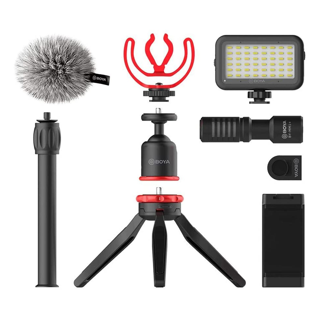 Combo Mic thu âm BOYA BY-VG350 gồm có 9 món phụ kiện sẽ giúp cho công việc ghi hình và thu âm của bạn trở nên dễ dàng hơn. Khi mua combo BOYA BY-VG350, bạn sẽ nhận được micro shotgun BY-MM1+, lông lọc gió micro, tripod ULANZI SEVENOAK SK-T1, ngàm kẹp điện thoại, Clamp with Cold Shoe Mount BY-C12, Đèn Video 48 Led, đầu kẹp điện thoại, thanh điều chỉnh độ cao,... Tất cả các món phụ kiện này đều khá cần thiết cho công việc quay video trên điện thoại. Khi mua hàng, những món phụ kiện này sẽ được đặt trong một chiếc hộp khá lớn và trên mặt của hộp được in logo của thương hiệu.