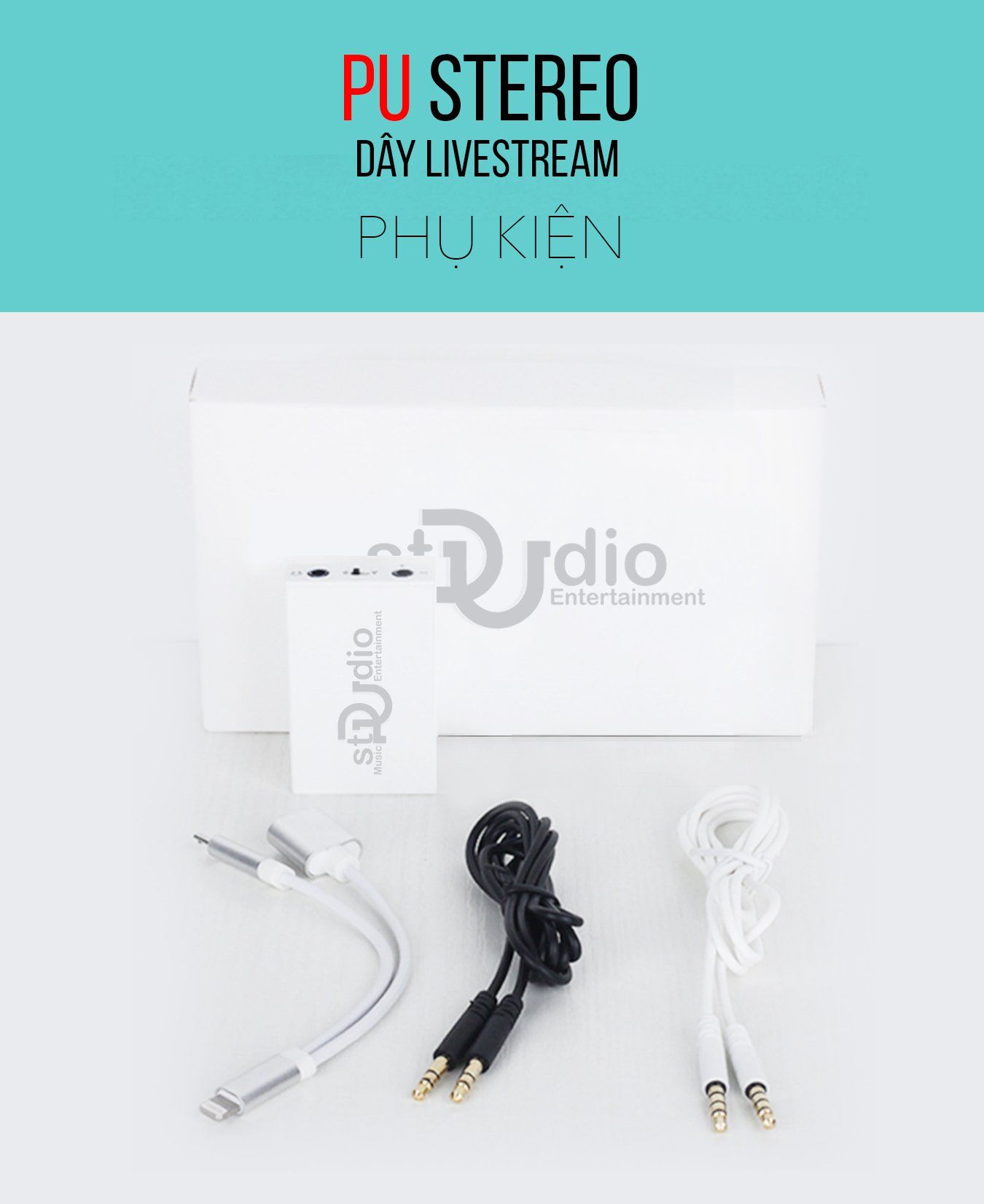 Dây livestream PU Stereo được thiết kế với cục hình vuông, bên trong là bo mạch chủ. Nơi tiếp nhận và phát âm thanh qua cổng Micro-usb. Truyền tín hiệu từ đó đi qua cổng sạc Lightning (Điện thoại Iphone).