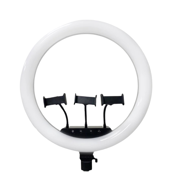 3 giá đỡ điện thoại: Được gắn ở bên trong vòng đèn livestream, bên dưới là các nút điều chỉnh độ rộng cho giá đỡ hoặc điều chỉnh nhiệt độ màu trực tiếp lên các nút điều chỉnh này.