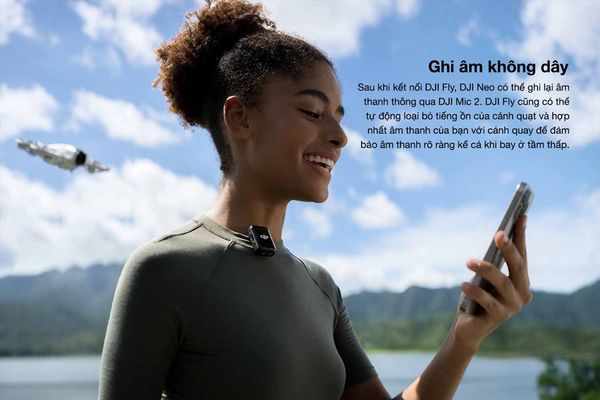 Sau khi liên kết ứng dụng DJI Fly trên điện thoại thông minh của bạn, DJI Neo có thể ghi lại âm thanh thông qua DJI Mic 2 (đã liên kết Bluetooth với điện thoại) hoặc kết nối trực tiếp với micro trên điện thoại của bạn. Đồng thời, DJI Fly sẽ tự động loại bỏ tiếng ồn cánh quạt và hợp nhất đoạn âm thanh với cảnh quay của bạn để đảm bảo âm thanh rõ ràng ngay cả khi quay vlog ở độ cao thấp.