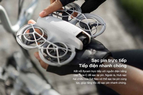 Để sạc lại năng lượng, bạn có thể kết nối trực tiếp máy bay với nguồn điện thông qua cáp Type-C tiện lợi, cung cấp năng lượng nhanh chóng cho bạn trở lại đường bay. Ngoài ra, bạn cũng có thể sử dụng trung tâm sạc hai chiều DJI Neo Two-Way Charging Hub để sạc cùng lúc 3 pin, tăng tốc cả về thời gian lẫn hiệu quả sạc.