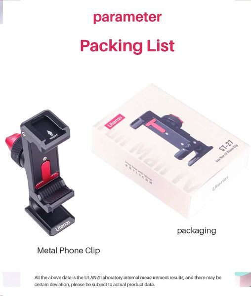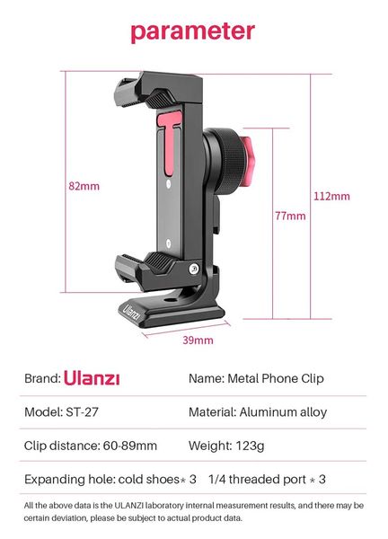 Kẹp điện thoại Ulanzi ST27 được thiết kế dành cho các điện thoại thông minh có kích thước từ 60 đến 89mm, phù hợp với hầu hết các dòng điện thoại hiện nay trên thị trường. Sản phẩm có kích thước 112 x 39mm và trọng lượng chỉ 123g, rất dễ dàng mang theo khi di chuyển.