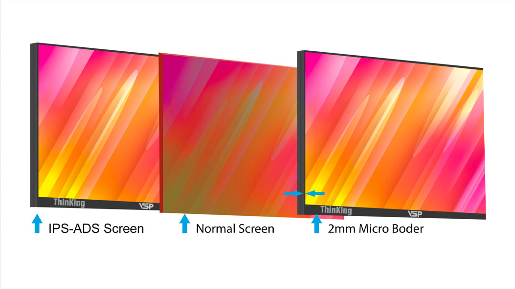 Điểm nổi bật nhất của màn hình VSP IPS Thinking là thiết kế tràn viền trên 3 cạnh. Viền màn hình siêu mỏng chỉ 5.5mm giúp tối đa hóa diện tích hiển thị. Với thiết kế này, người dùng có thể dễ dàng ghép nối nhiều màn hình để tạo ra một màn hình liền mạch, phù hợp cho các nhu cầu đồ họa chuyên nghiệp.