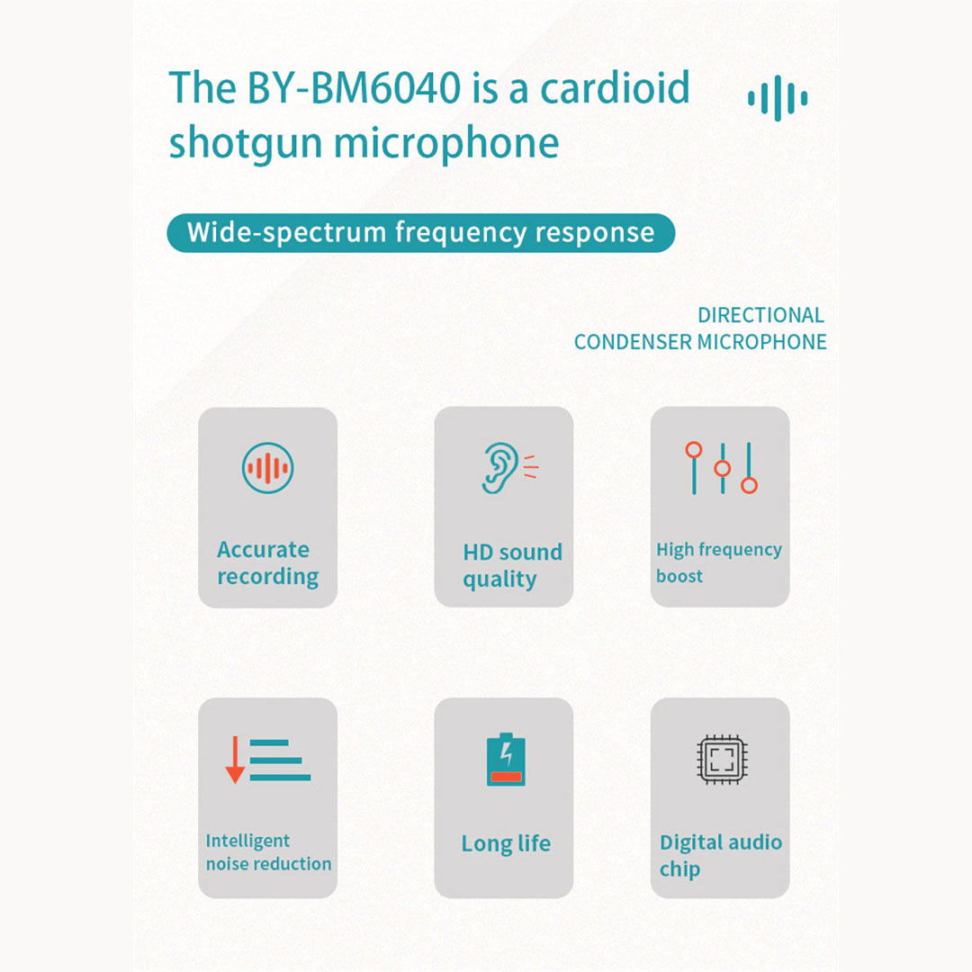 BY-BM6040 là dòng micro shotgun đặc trưng, hiển nhiên nó sẽ được trang bị những tính năng và phụ kiện cơ bản, có thể kể đến như: