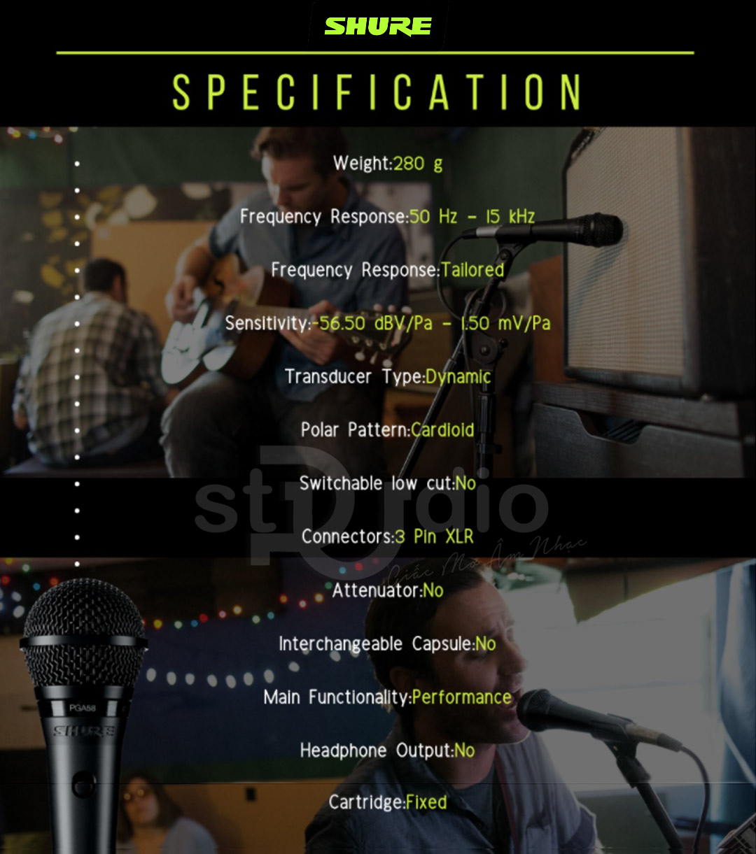 Hơn nữa, sản phẩm còn có dây shure dành riêng cho nhạc cụ PGA57-LC của Shure, đây là một thiết bị âm thanh chất lượng cao chuyên dụng với một thiết kế chuyên dụng có cấu tạo bằng kim loại đen và lưới tản nhiệt. Nhờ đó nó có thể được sử dụng để ghi lại âm thanh cho các nhạc cụ như là guitar, trống âm thanh, bộ khuếch đại và còn hơn thế nữa.