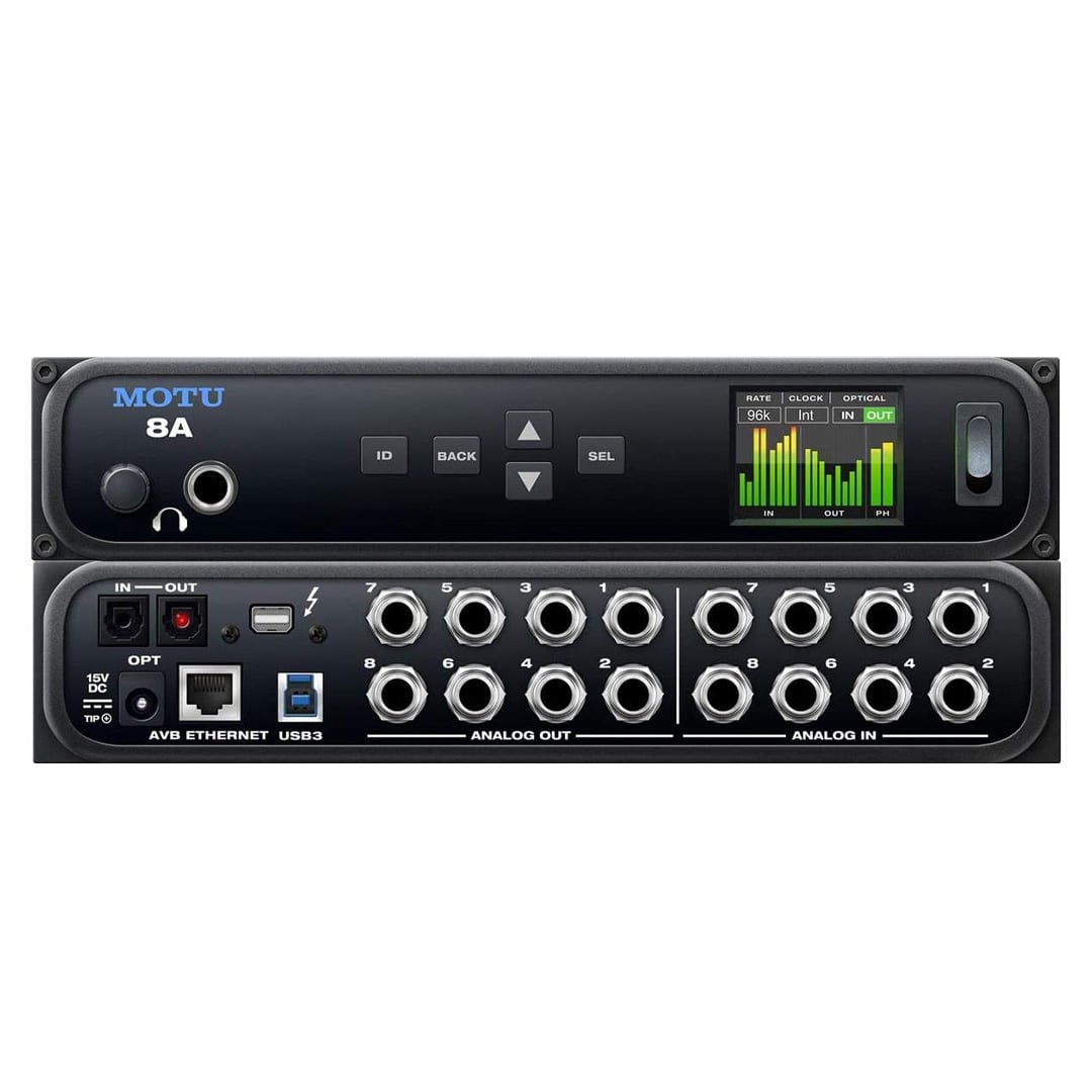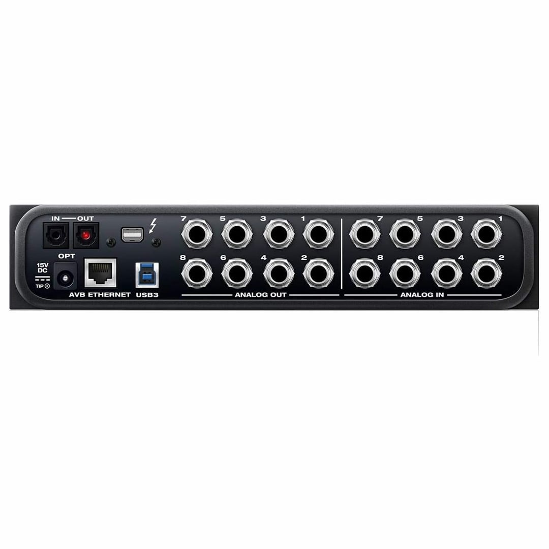 Kết Nối Linh Hoạt: Motu 8A được trang bị nhiều cổng kết nối như 8 cổng analog đầu vào/đầu ra, 2 cổng ADAT, và 1 cổng SPDIF. Bên cạnh đó, khả năng kết nối qua USB 2.0 và AVB Ethernet giúp người dùng dễ dàng tích hợp với các thiết bị khác trong hệ thống thu âm.