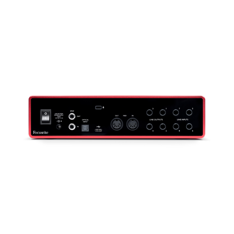 Một điều có thể khẳng định rằng Scarlett 18i8 3 Gen là một Sound card chuyên nghiệp dành cho các thiết bị thu âm và hát livestream đó chính là khả năng kết nối đến thiết bị MIDI mở rộng thông qua cổng MIDI IN và MIDI OUT, nhận hoặc truyền tín hiệu số dạng S/PDIF thông qua cổng S/PDIF và điểm đặc biệt của sound card chuyên nghiệp Scarlett 18i8 đó chính là cổng Optical có thể mang dữ liệu của 8 kênh tín hiệu với tốc độ lấy mẫu 44.148kHz hoặc 4 kênh với tốc độ lấy mẫu 82.2/96kHz.
